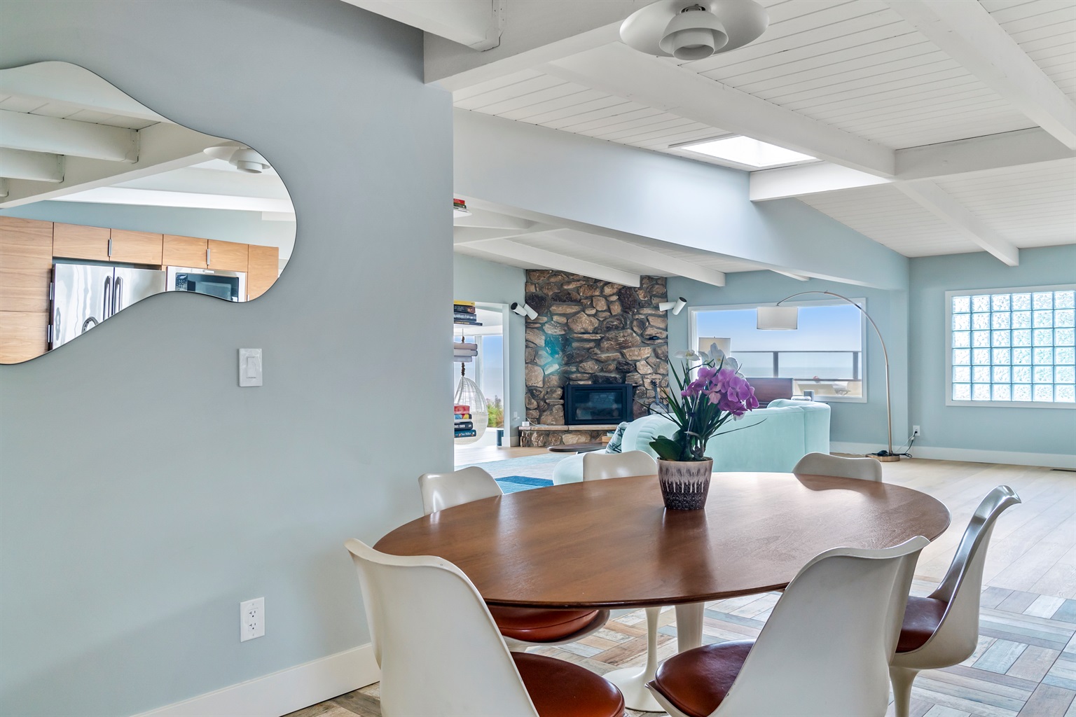 From the street side, you’ll enter a private courtyard featuring a large in ground gas fire pit before stepping into the main house. Inside, light-filled living spaces are framed by sweeping ocean views. The chef’s kitchen boasts sleek cabinetry, premium appliances, and an oversized island, opening seamlessly to a spacious dining area and stylish living room with a stone fireplace and multiple seating areas perfect for reading, relaxing, and soaking in the view.