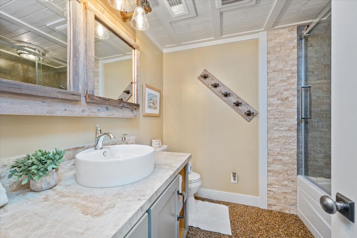 Prepare meals in the fully stocked kitchen with updated appliances, and enjoy dining with the ocean as your backdrop. Down the hallway, you'll find the first bathroom with a shower/tub combo, along with a stackable washer and dryer for convenience. The primary bedroom features a luxurious king-sized bed and a private ensuite bathroom with a walk-in shower. The guest bedroom is equipped with a comfortable queen-sized bed for restful sleep.