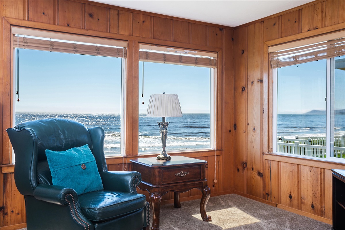 2 Bedrooms • 2 Bathrooms 2 Baths • Sleeps 2-6This welcoming duplex on the north end of Studio Drive is a wonderful family beach rental. This home is located on the bluff, and features sweeping ocean views, grassy lawns, and an enclosed ocean facing brick patio. It's the perfect property for BBQing and enjoying our famous Cayucos sunsets! The interior of the home is furnished with comfortable furniture, antiques and family heirlooms. The living room has vintage knotty pine walls, large view windows, a large flat screen TV/DVD, a piano and novel filled bookshelves to help you relax. The kitchen has granite counters, a breakfast bar, stainless steel appliances, a 5 burner cast iron stove and a convection oven. Both bedrooms have flat screen televisions. Only 38 stairs to the sand!