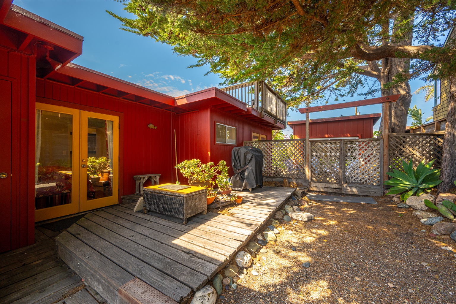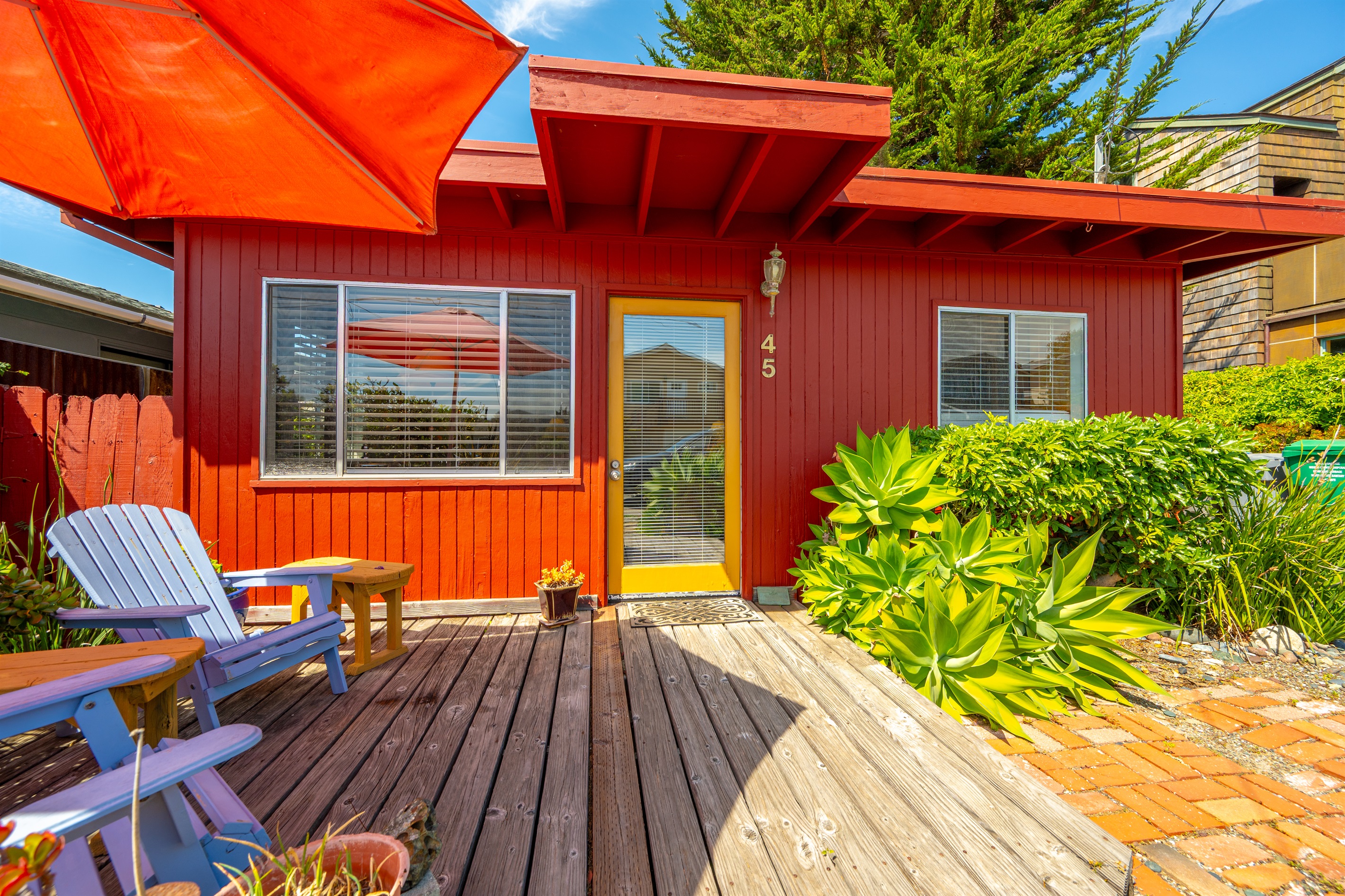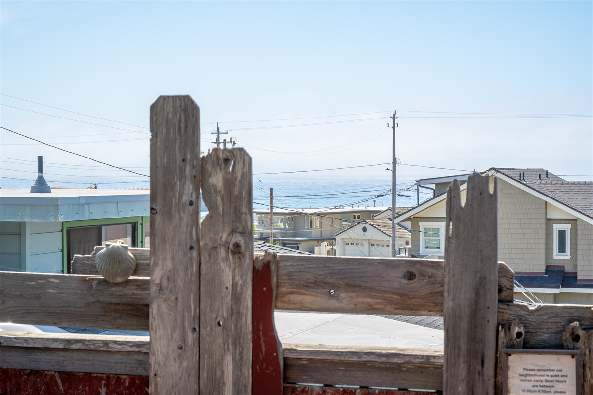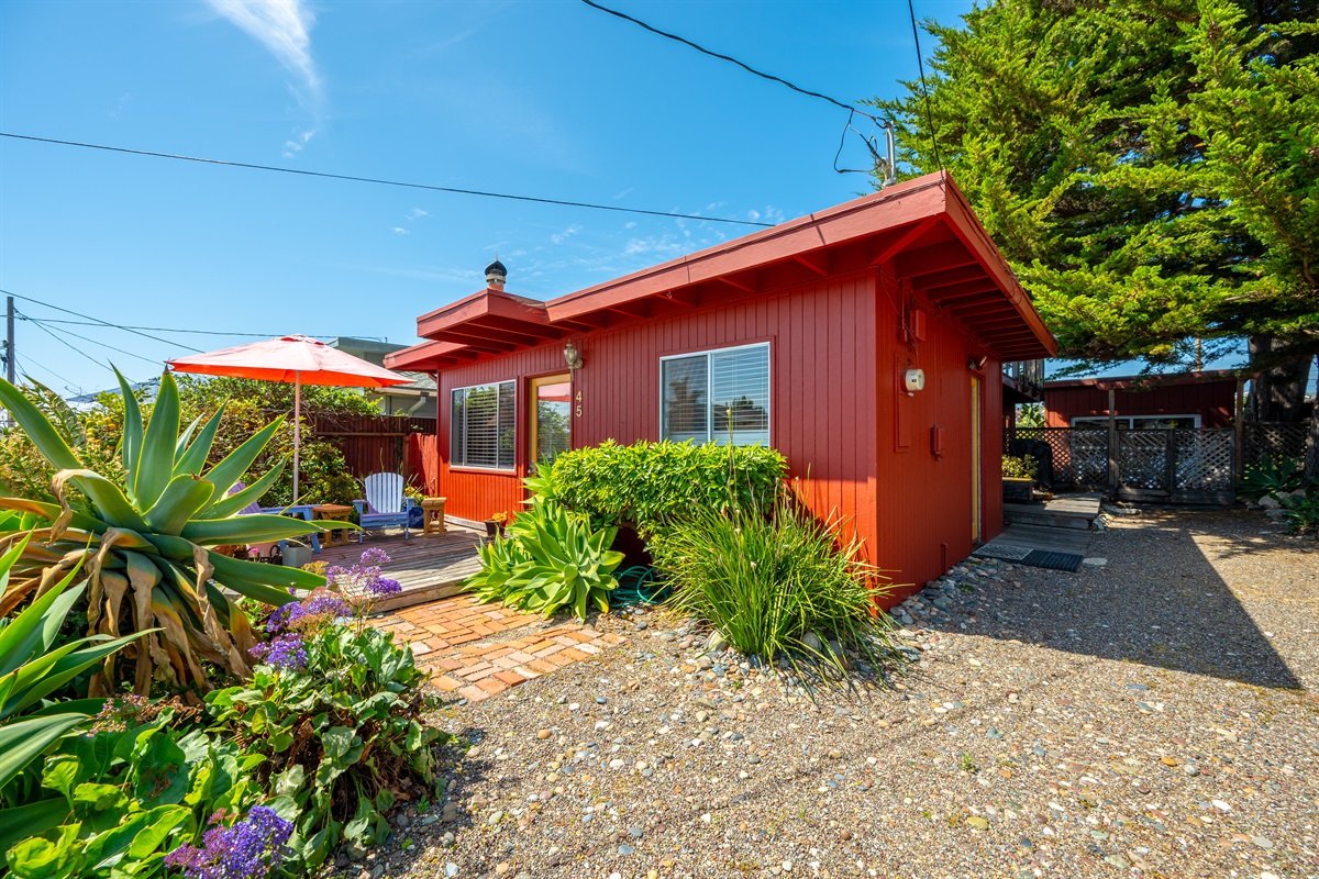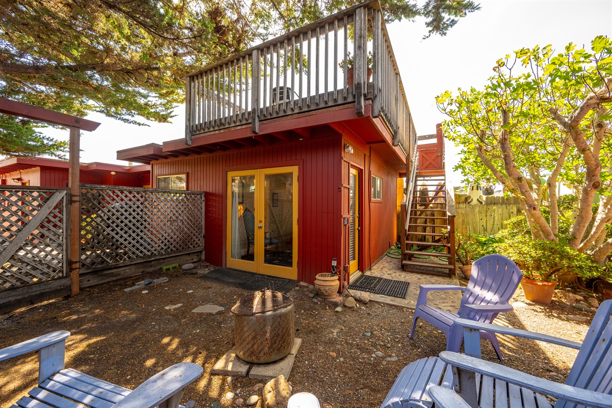 2 Bedrooms • 2 Bathrooms 2 Baths • Sleeps 2-6Decked Out is a recently renovated 2 bedroom 2 bath classic beach cottage, located in the numbered streets. 1 1/2 blocks walk to 10th Street beach access. The cozy living room and kitchen are filled with light and wonderful pieces of art. The living room has a Flat screen TV and a corner wood burning stove. The kitchen is well appointed, and includes a 5 burner gas stove. The kitchen door opens to a small patio. Master bedroom has a Cal King sized bed and French doors that open to the fenced back yard, and features an en-suite bath. The 2nd bedroom has a Queen sized bed with French doors that open to a side patio. The upper deck is a great space to enjoy the ocean breeze and views of the Pacific Ocean. An enclosed spacious back yard has an outdoor wood burning fire pit.