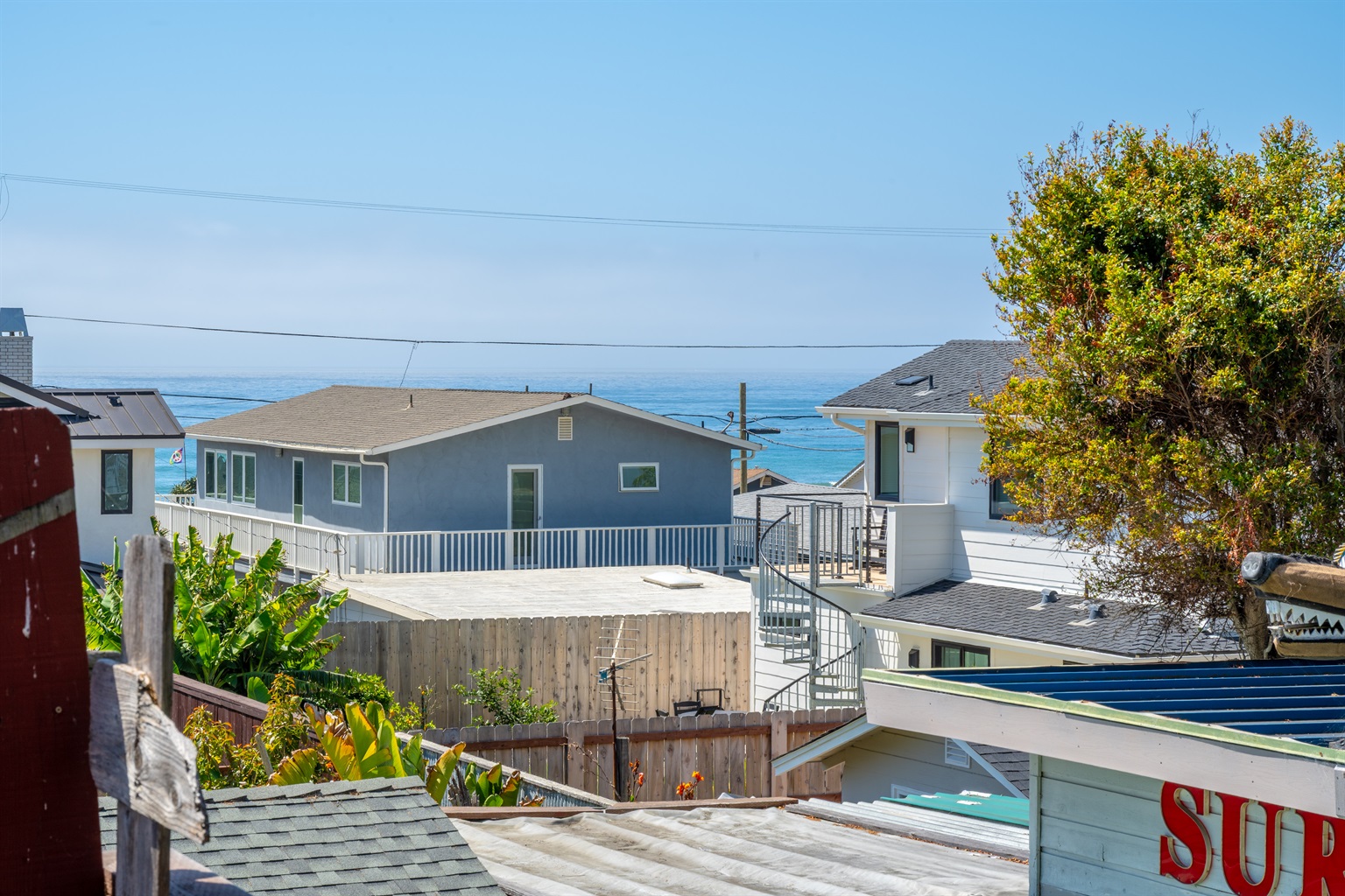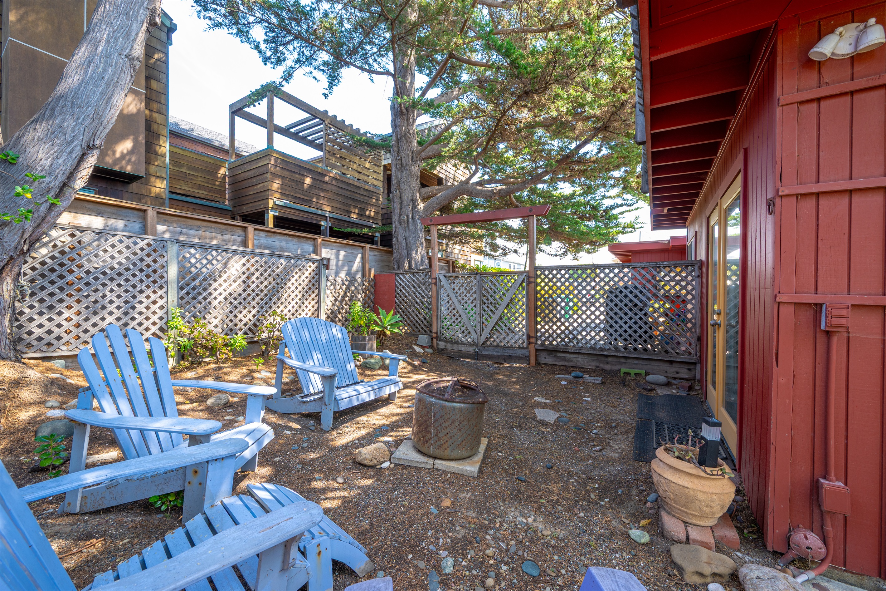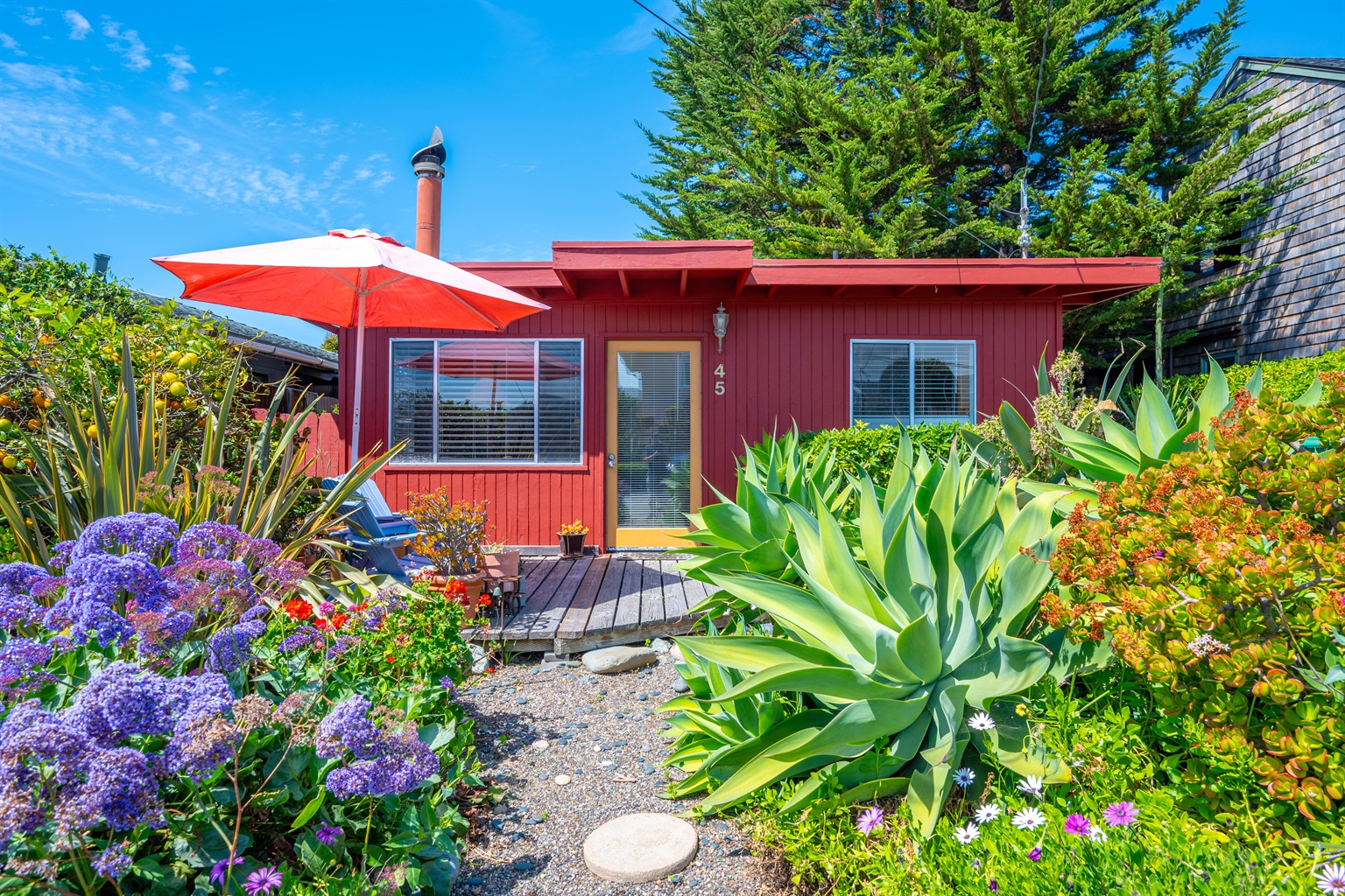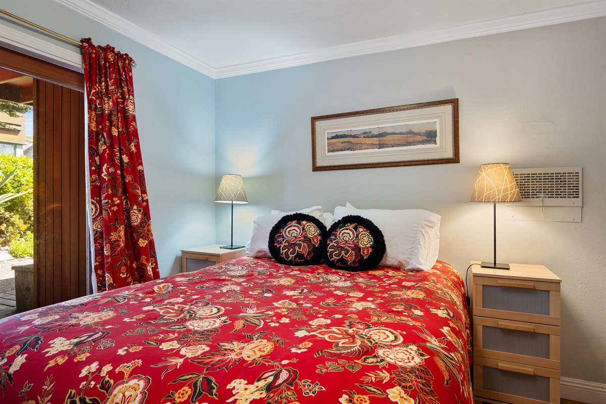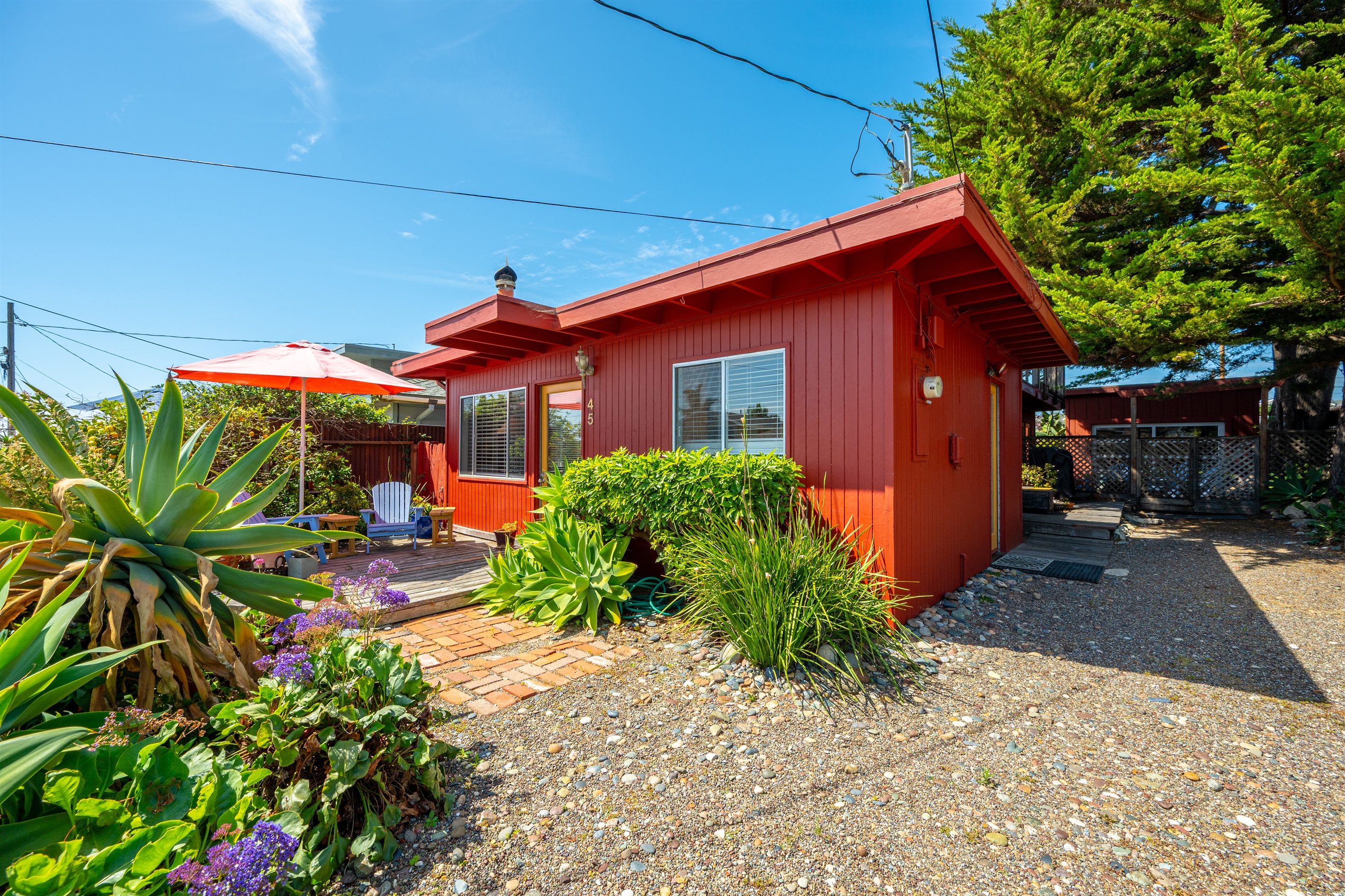 2 Bedrooms • 2 Bathrooms 2 Baths • Sleeps 2-6Decked Out is a recently renovated 2 bedroom 2 bath classic beach cottage, located in the numbered streets. 1 1/2 blocks walk to 10th Street beach access. The cozy living room and kitchen are filled with light and wonderful pieces of art. The living room has a Flat screen TV and a corner wood burning stove. The kitchen is well appointed, and includes a 5 burner gas stove. The kitchen door opens to a small patio. Master bedroom has a Cal King sized bed and French doors that open to the fenced back yard, and features an en-suite bath. The 2nd bedroom has a Queen sized bed with French doors that open to a side patio. The upper deck is a great space to enjoy the ocean breeze and views of the Pacific Ocean. An enclosed spacious back yard has an outdoor wood burning fire pit.