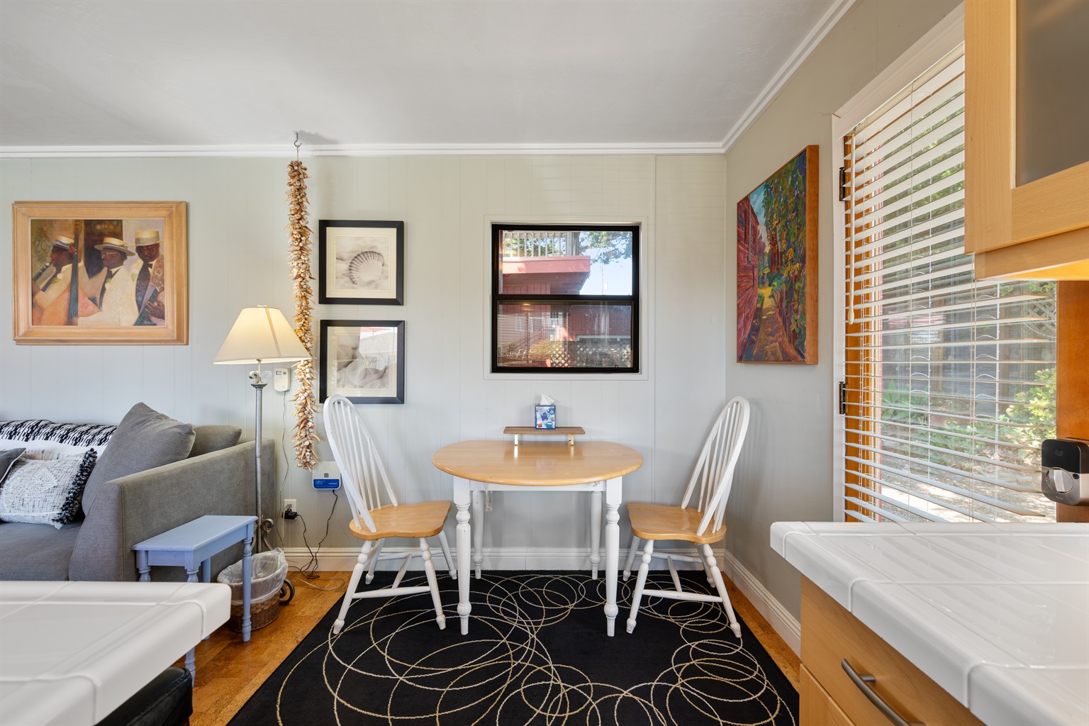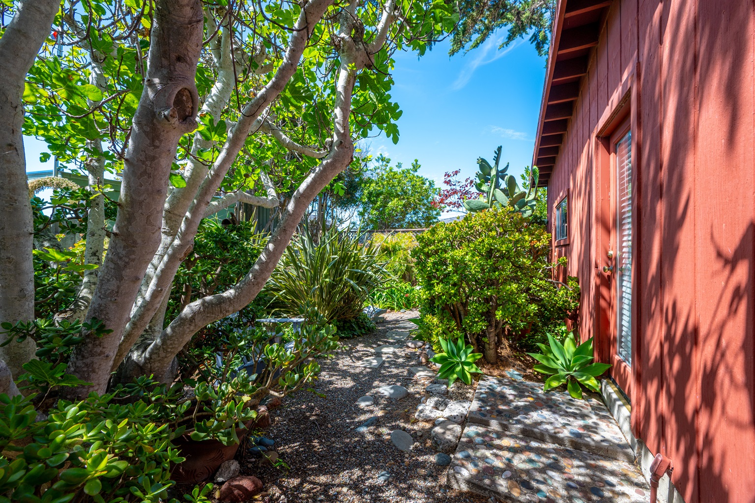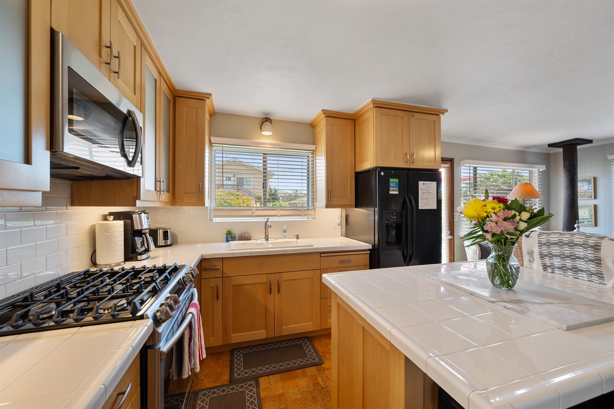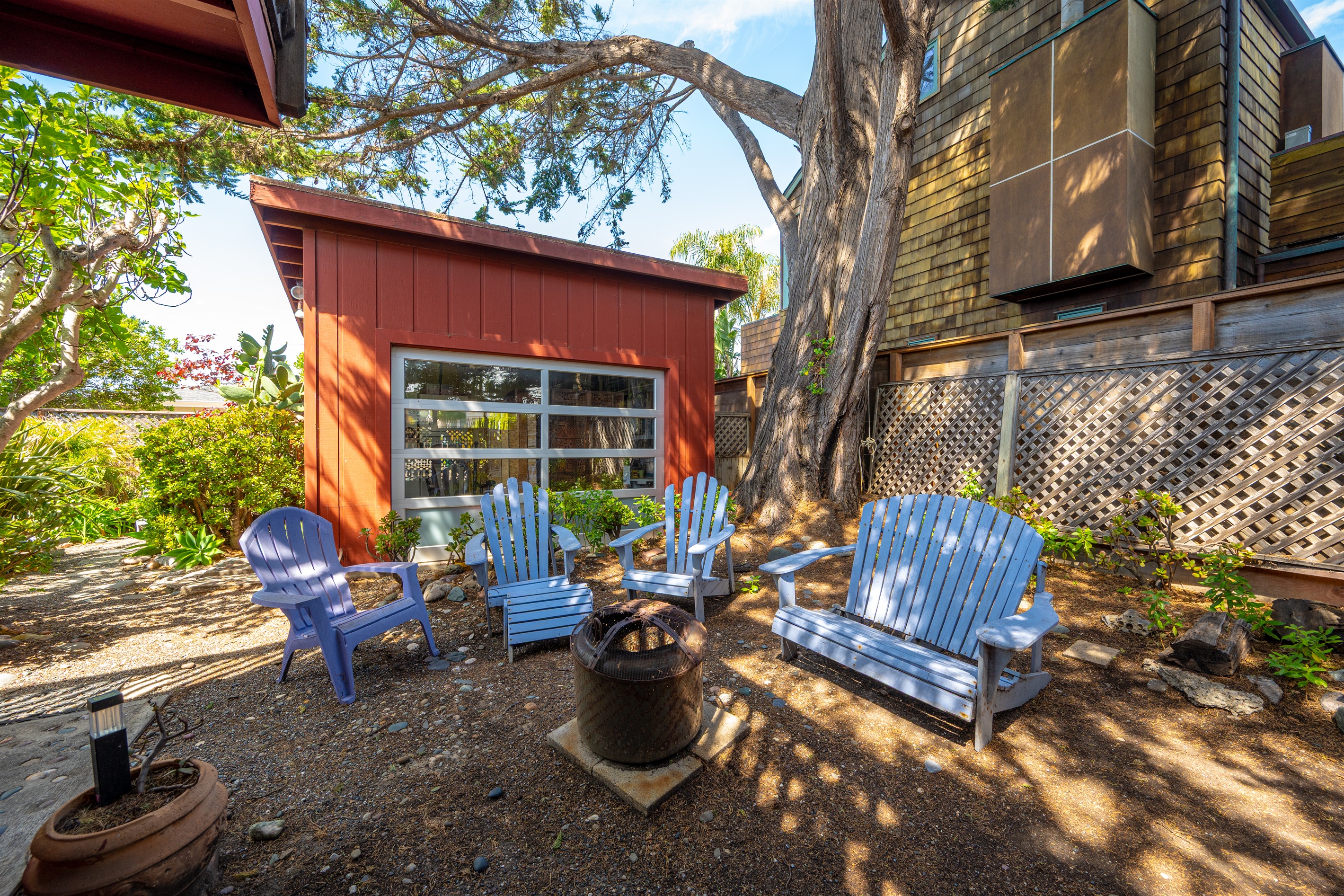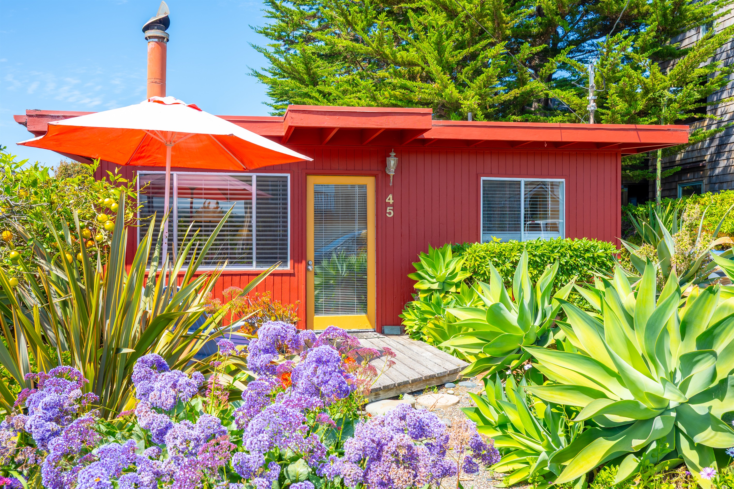 2 Bedrooms • 2 Bathrooms 2 Baths • Sleeps 2-6Decked Out is a recently renovated 2 bedroom 2 bath classic beach cottage, located in the numbered streets. 1 1/2 blocks walk to 10th Street beach access. The cozy living room and kitchen are filled with light and wonderful pieces of art. The living room has a Flat screen TV and a corner wood burning stove. The kitchen is well appointed, and includes a 5 burner gas stove. The kitchen door opens to a small patio. Master bedroom has a Cal King sized bed and French doors that open to the fenced back yard, and features an en-suite bath. The 2nd bedroom has a Queen sized bed with French doors that open to a side patio. The upper deck is a great space to enjoy the ocean breeze and views of the Pacific Ocean. An enclosed spacious back yard has an outdoor wood burning fire pit.