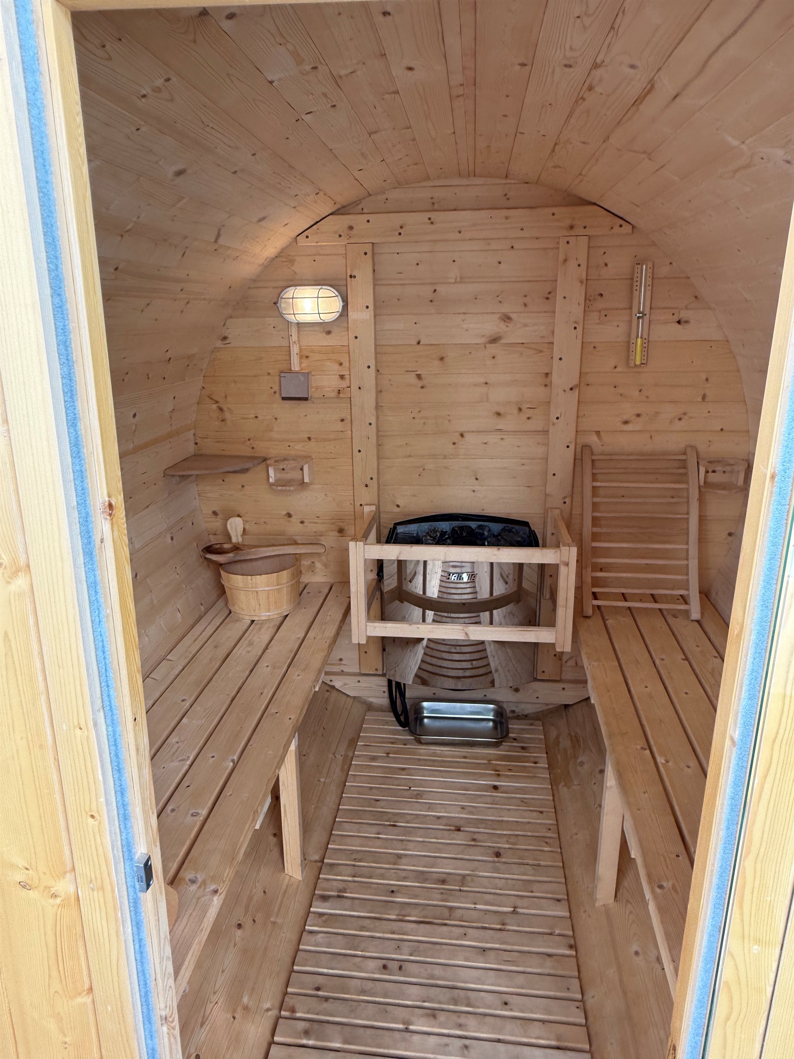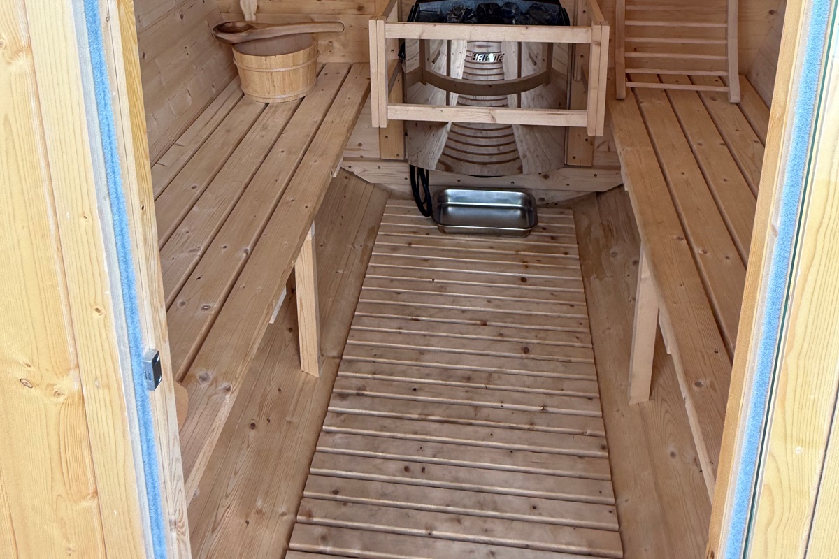 •Remote controlled gas fireplace in living room. •Hot Rock Sauna and hot/cold outdoor shower